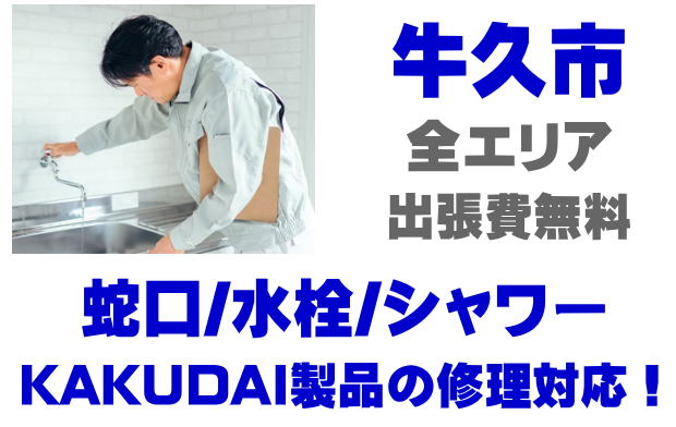 牛久市で水栓メーカーKAKUDAIの修理業者をお探しなら当社までお気軽にお問い合わせください。蛇口の水漏れ、シャワーの故障などカクダイ製に関するトラブルなら何でもご相談ください。